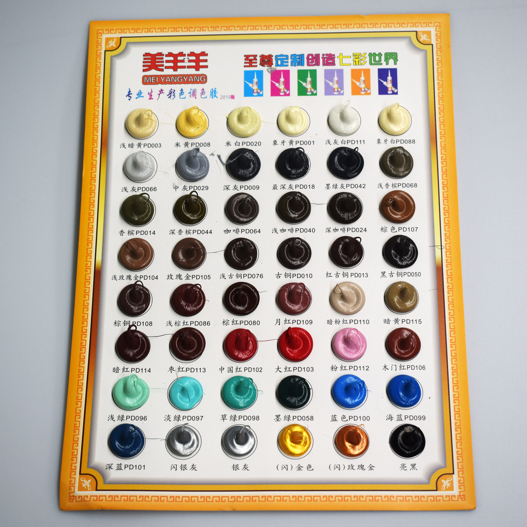 美羊羊品牌是专业的彩色玻璃胶品牌   色卡提供48种颜色可供选择   色卡上的颜色全部为现货库存,若订单数量过大导致库存不足最多3天可以发出   如果客户颜色比较特殊也可提供调色,起调量为20箱